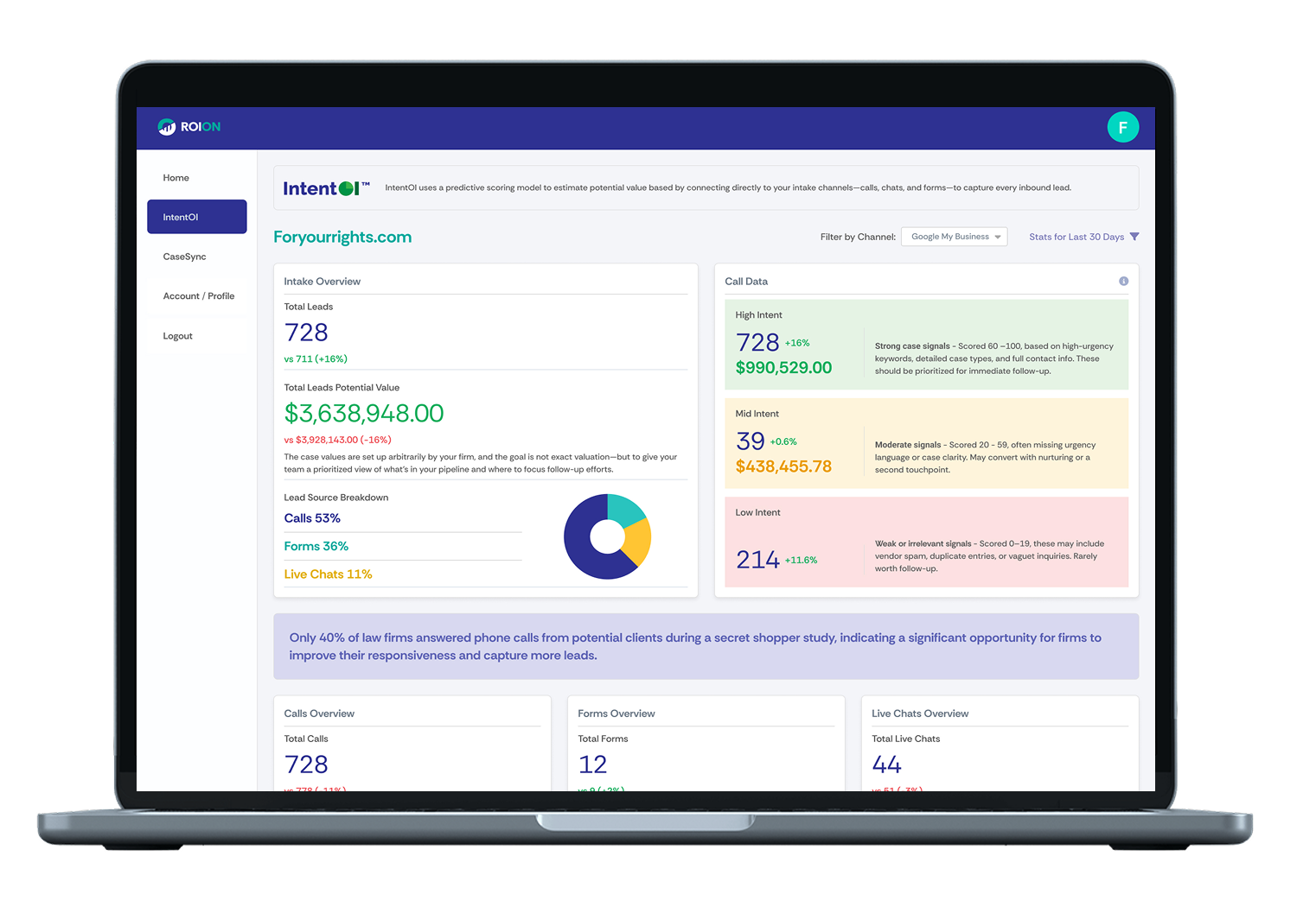 Our onboarding team will connect your systems so every lead, call, and case flows seamlessly into your ROIOn dashboard. No extra manual work—just clean, connected data.