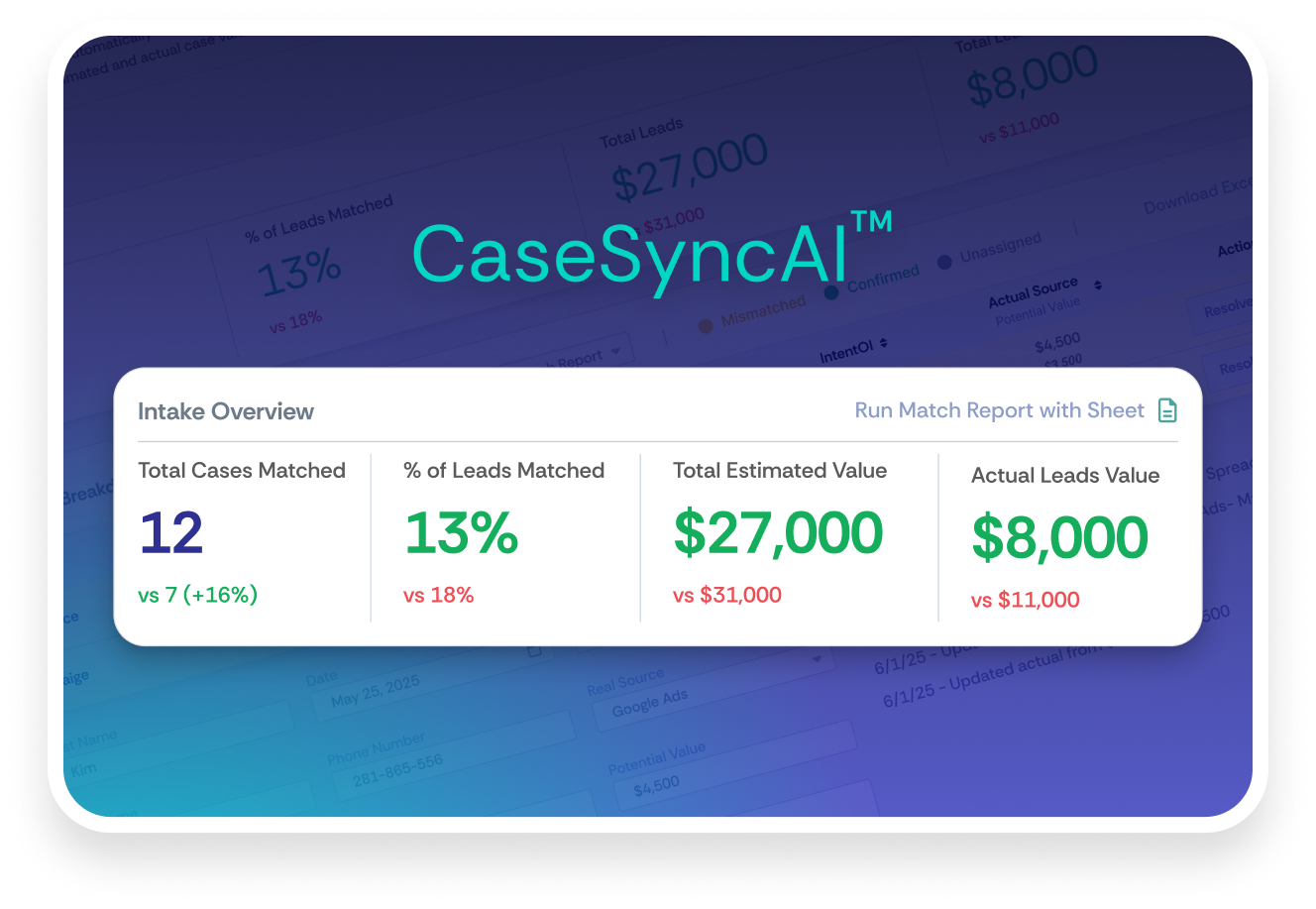 CaseSyncAI connects your lead sources with your signed case data by matching call tracking, CRM entries, and intake exports.