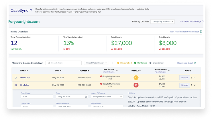 Using phone numbers and emails, CaseSyncAI matches leads from call tracking and web forms with case records—closing the gap between lead and client.